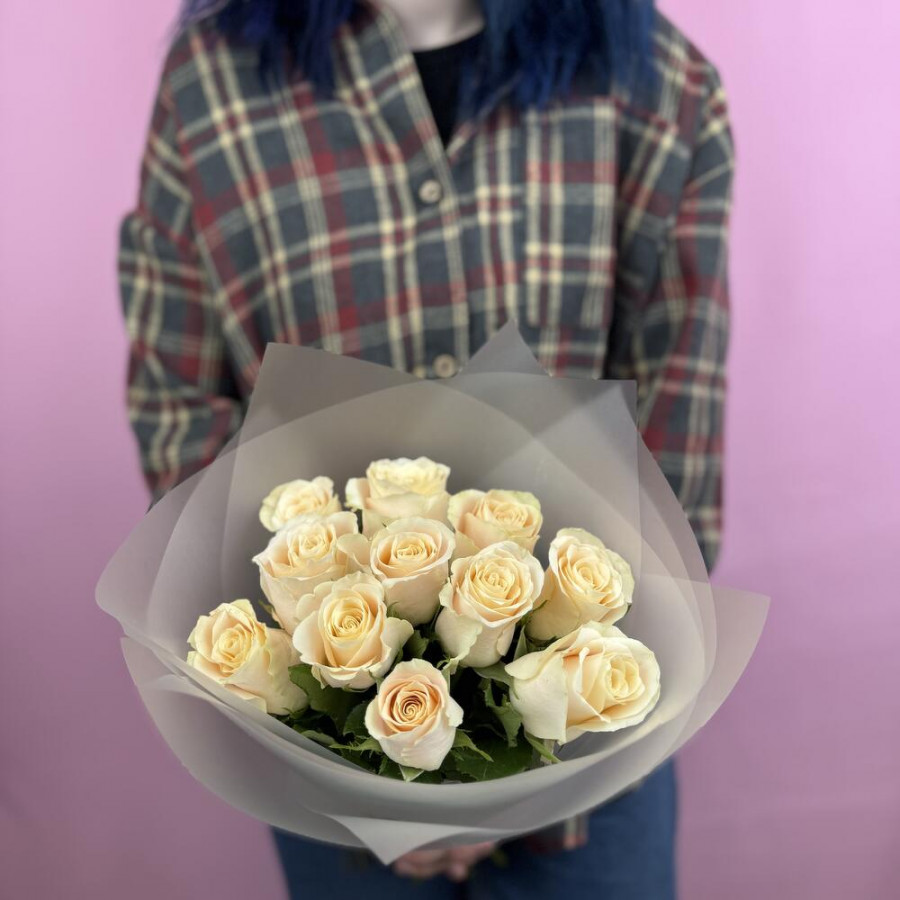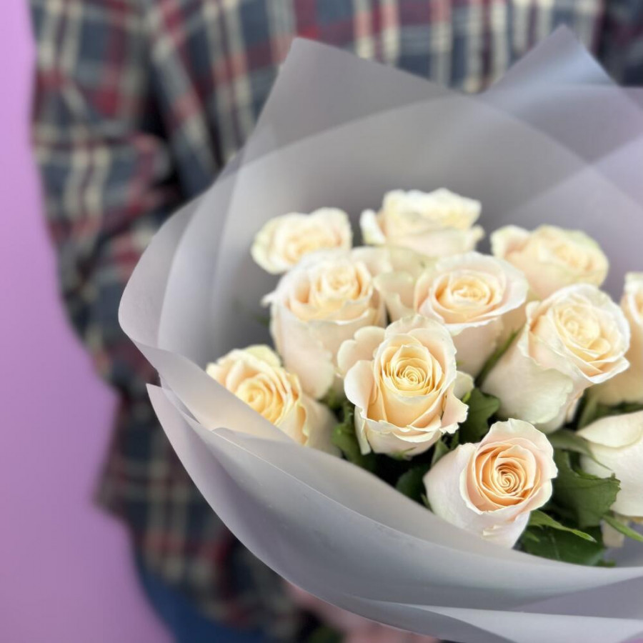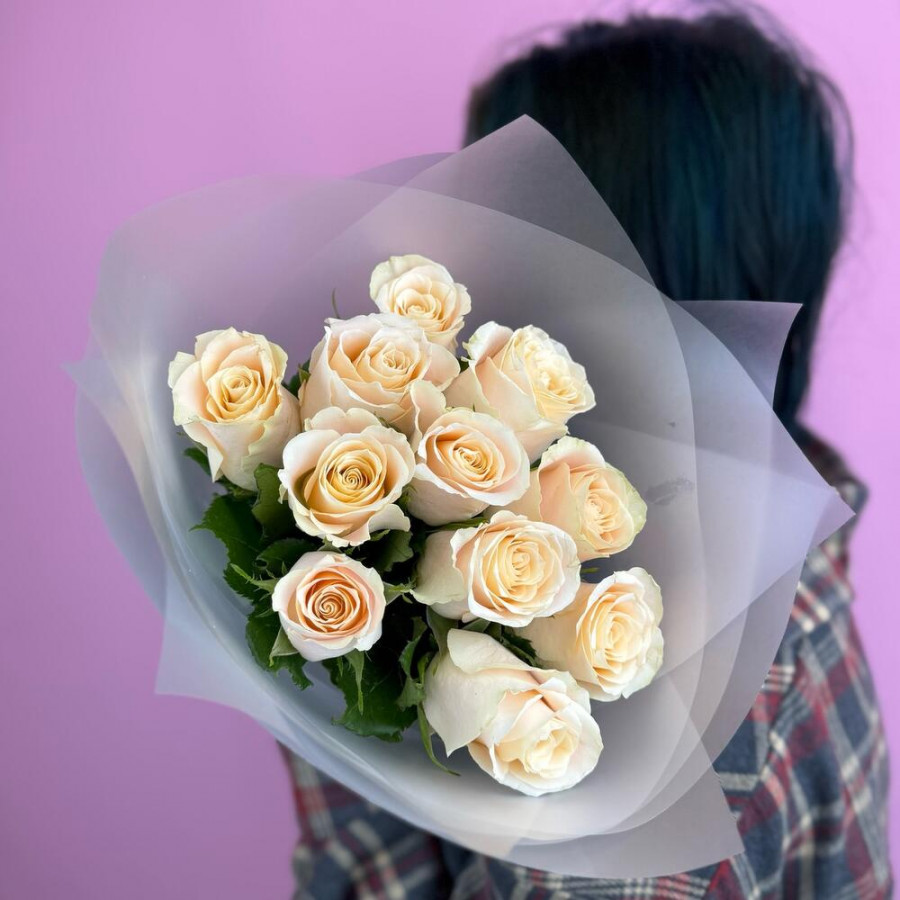 На фото букет из 11 кремовых роз. В составе: роза 11 шт, дизайнерская упаковка 1 шт, атласная лента 1 шт, . Все цветы свежие и ароматные, букет красиво оформлен и отлично подходит для подарка. Доступна доставка цветов или самовывоз.