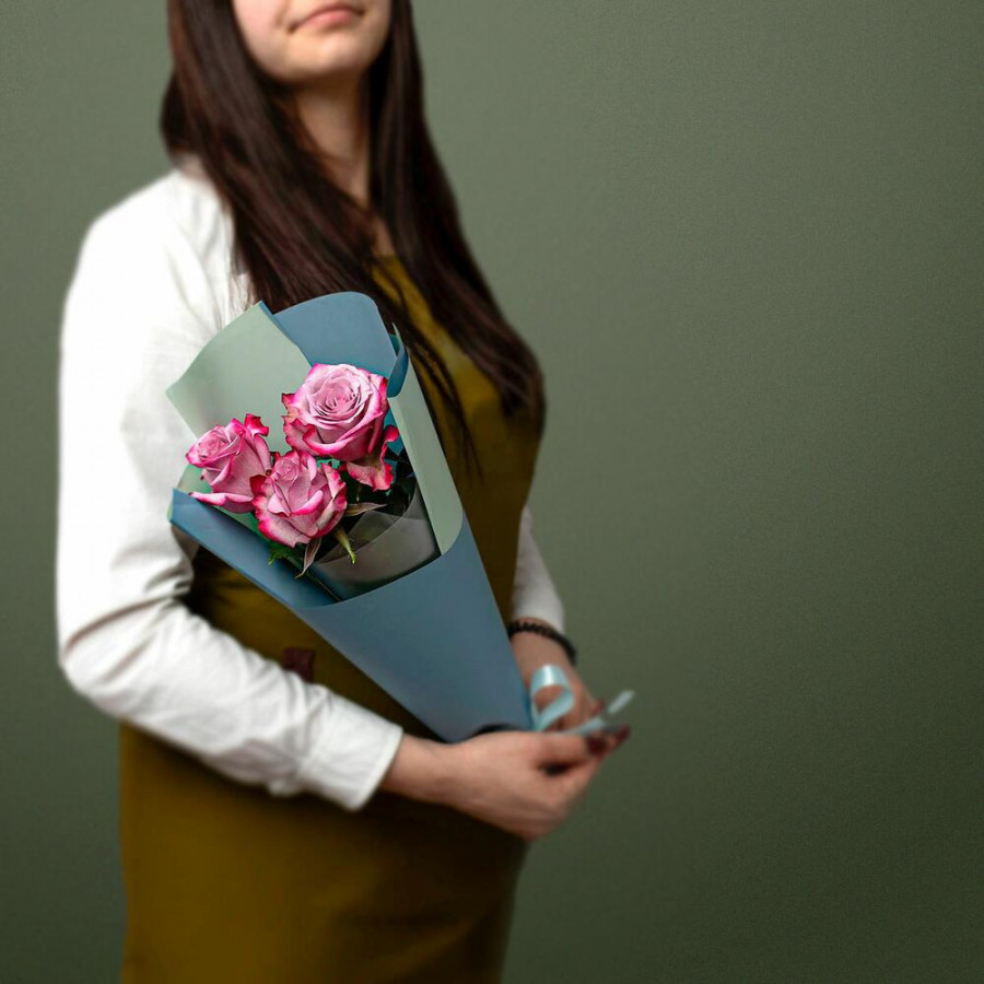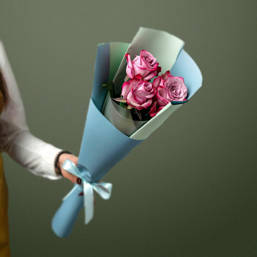На фото букет из 3 фиолетовых роз. В составе: роза 3 шт, дизайнерская упаковка 1 шт, атласная лента 1 шт, . Все цветы свежие и ароматные, букет красиво оформлен и отлично подходит для подарка. Доступна доставка цветов или самовывоз.