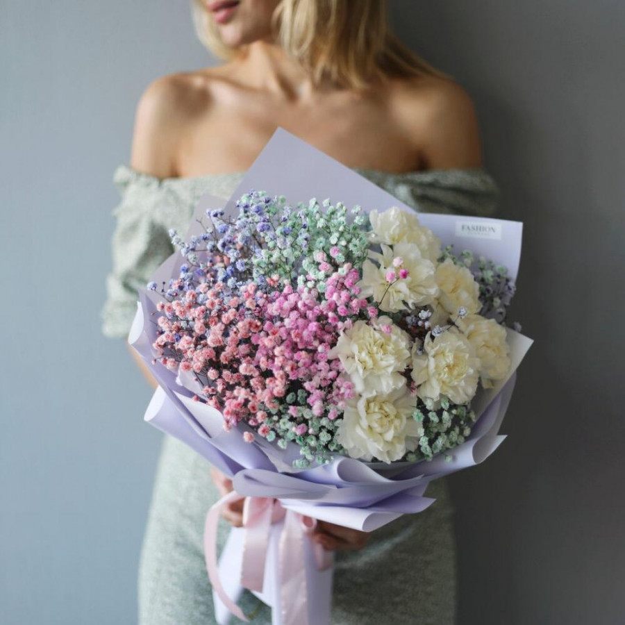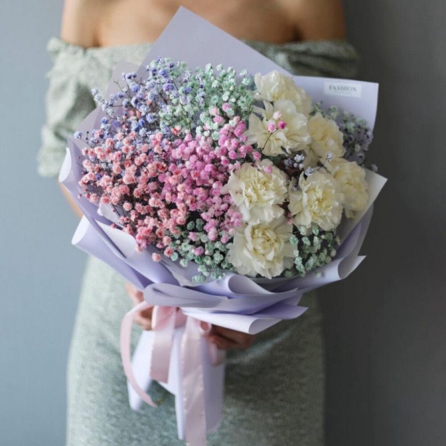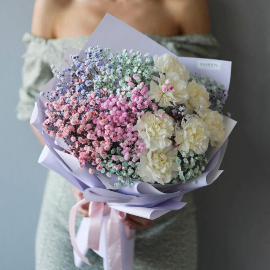На фото букет «северное сияние». В составе: гвоздика 7 шт, гипсофила 5 шт, писташ 4 шт, дизайнерская упаковка 1 шт, атласная лента 1 шт, . Все цветы свежие и ароматные, букет красиво оформлен и отлично подходит для подарка. Доступна доставка цветов или самовывоз.